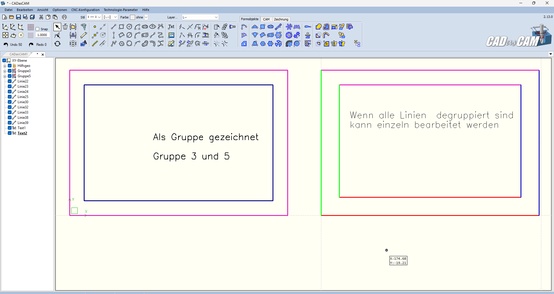 - Links wird Standardmäßig als Gruppe gezeichnet die Offsetkontur ist deshalb auch eine Gruppe.